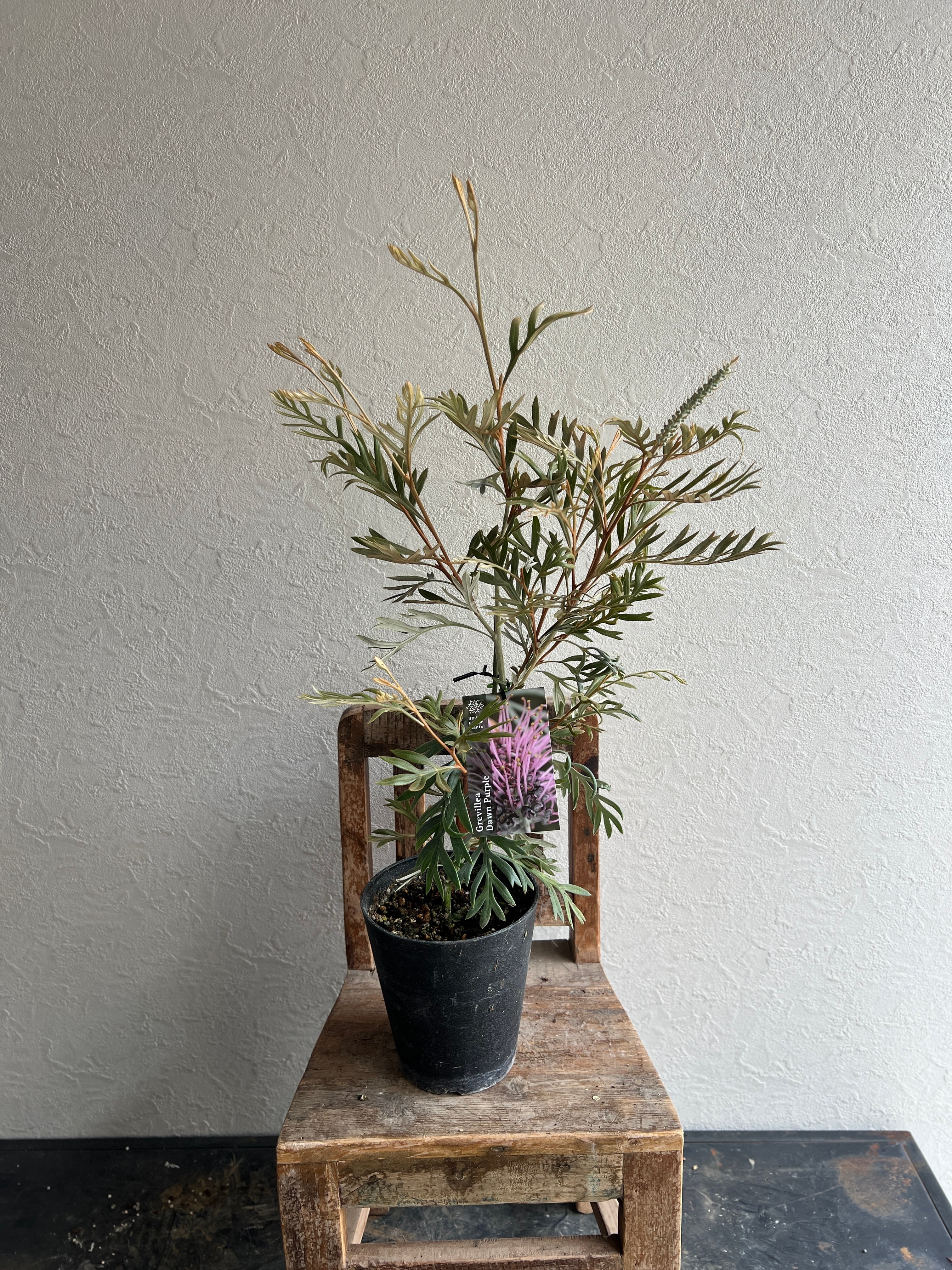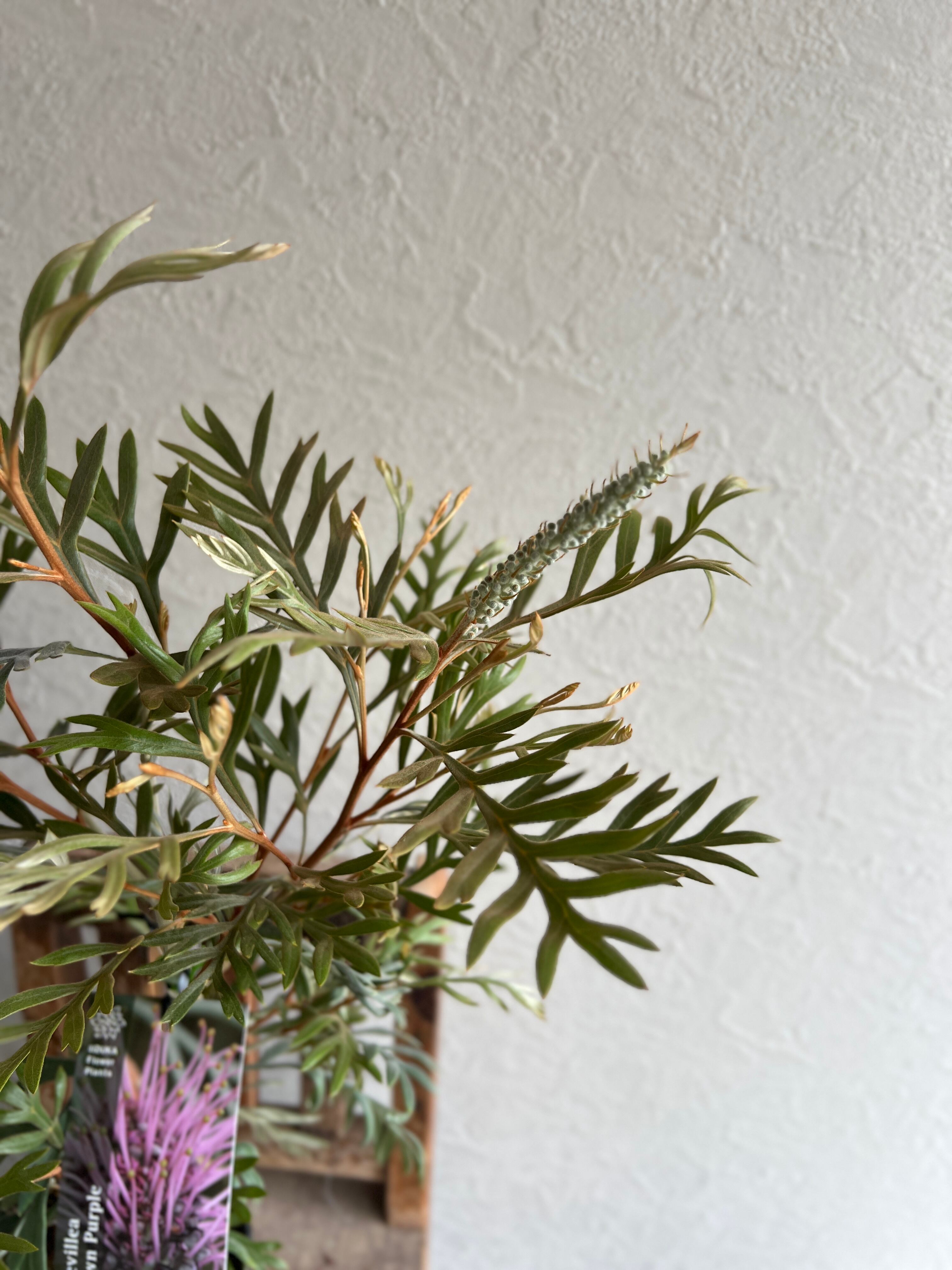 艶のある紫色の花とシルバーがかった葉っぱが美しいグレビレア。