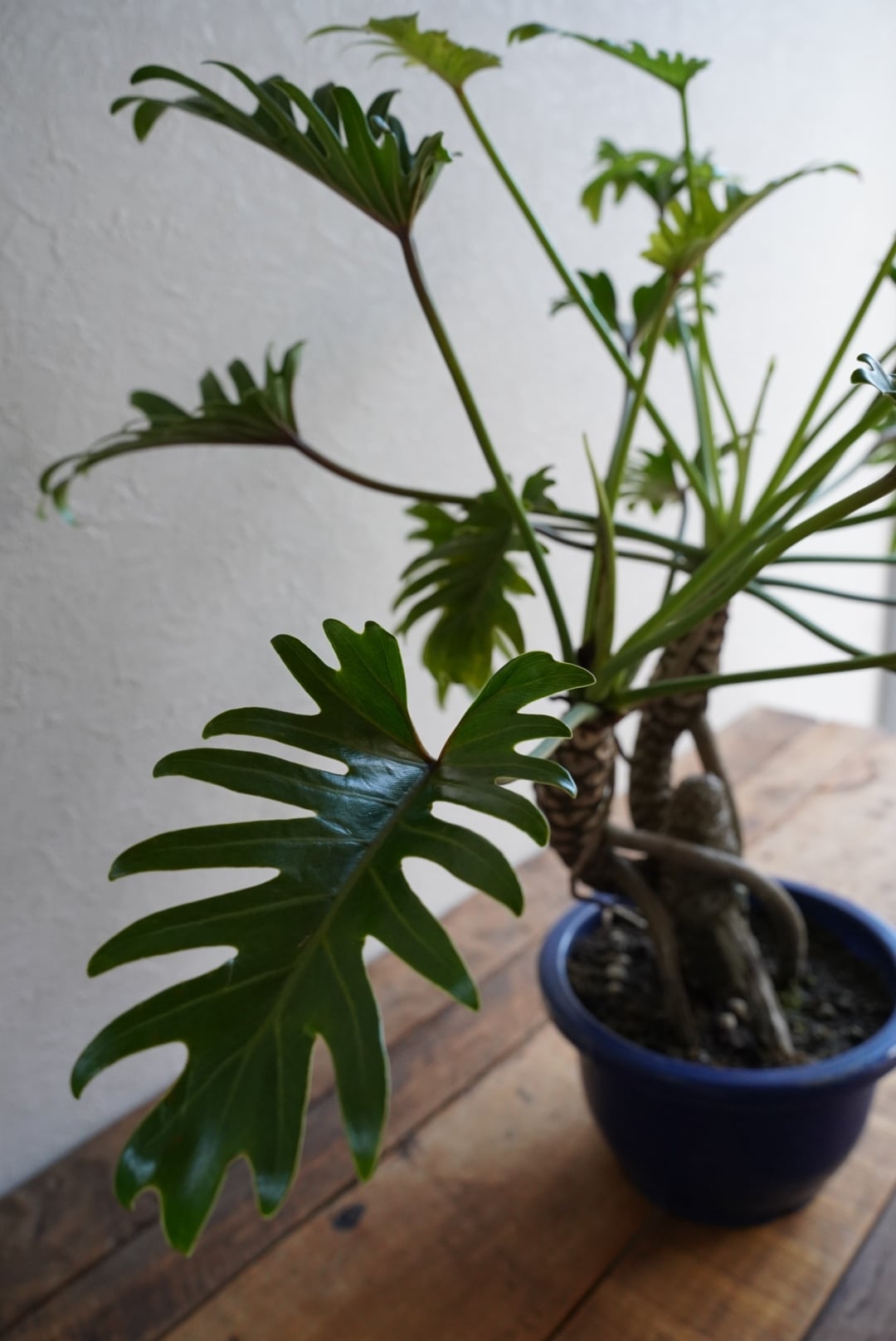 幹にはたくさんの目があるような模様がついていますが、こちらは古い葉っぱが落ちた跡です。気根、と呼ばれる根を伸ばしここからも水分を吸い上げます。お部屋に一鉢あるだけでアジアンでエキゾチックな雰囲気がでます。