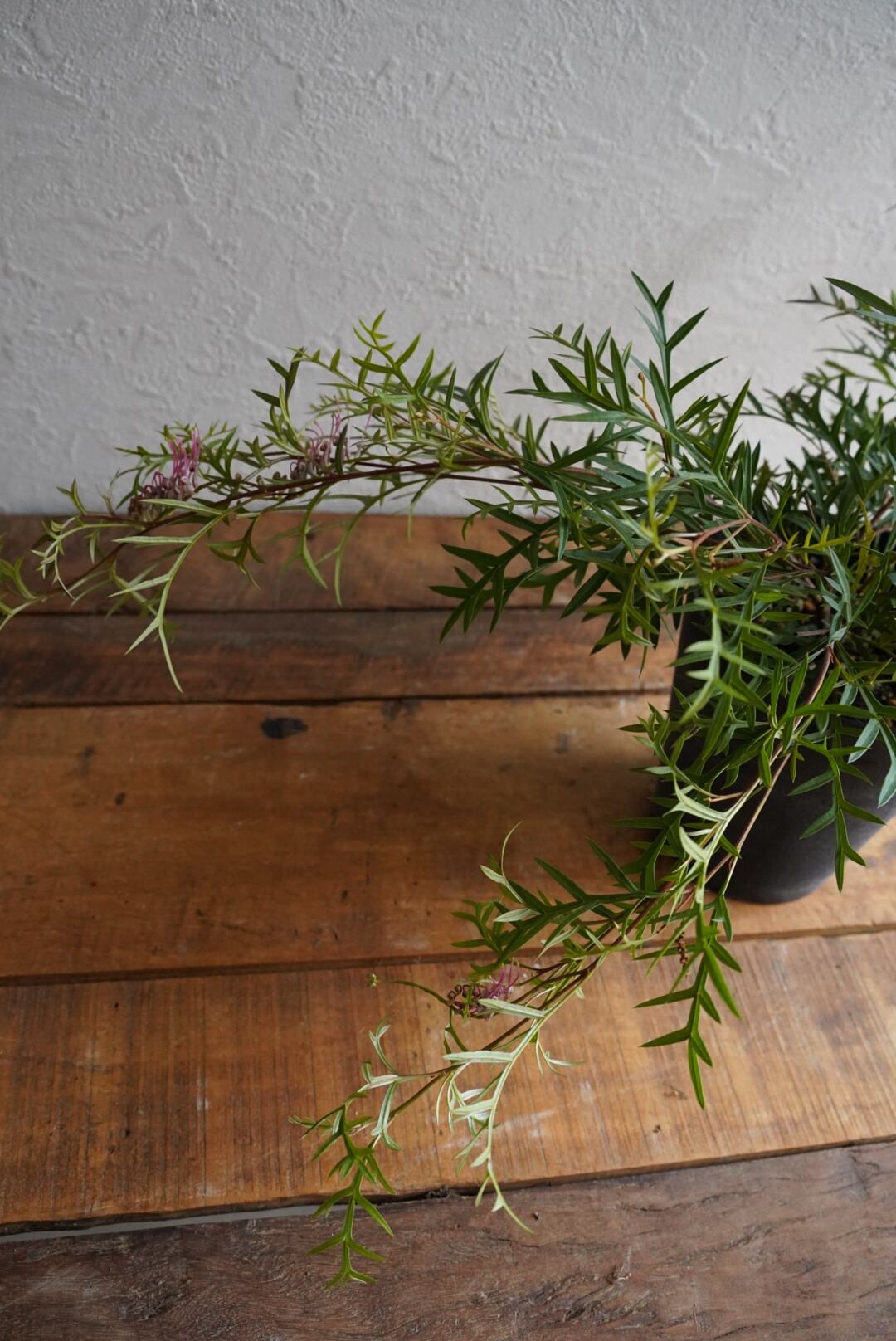 暗めの葉っぱと濃いピンク色の花がかっこいいグレビレア!