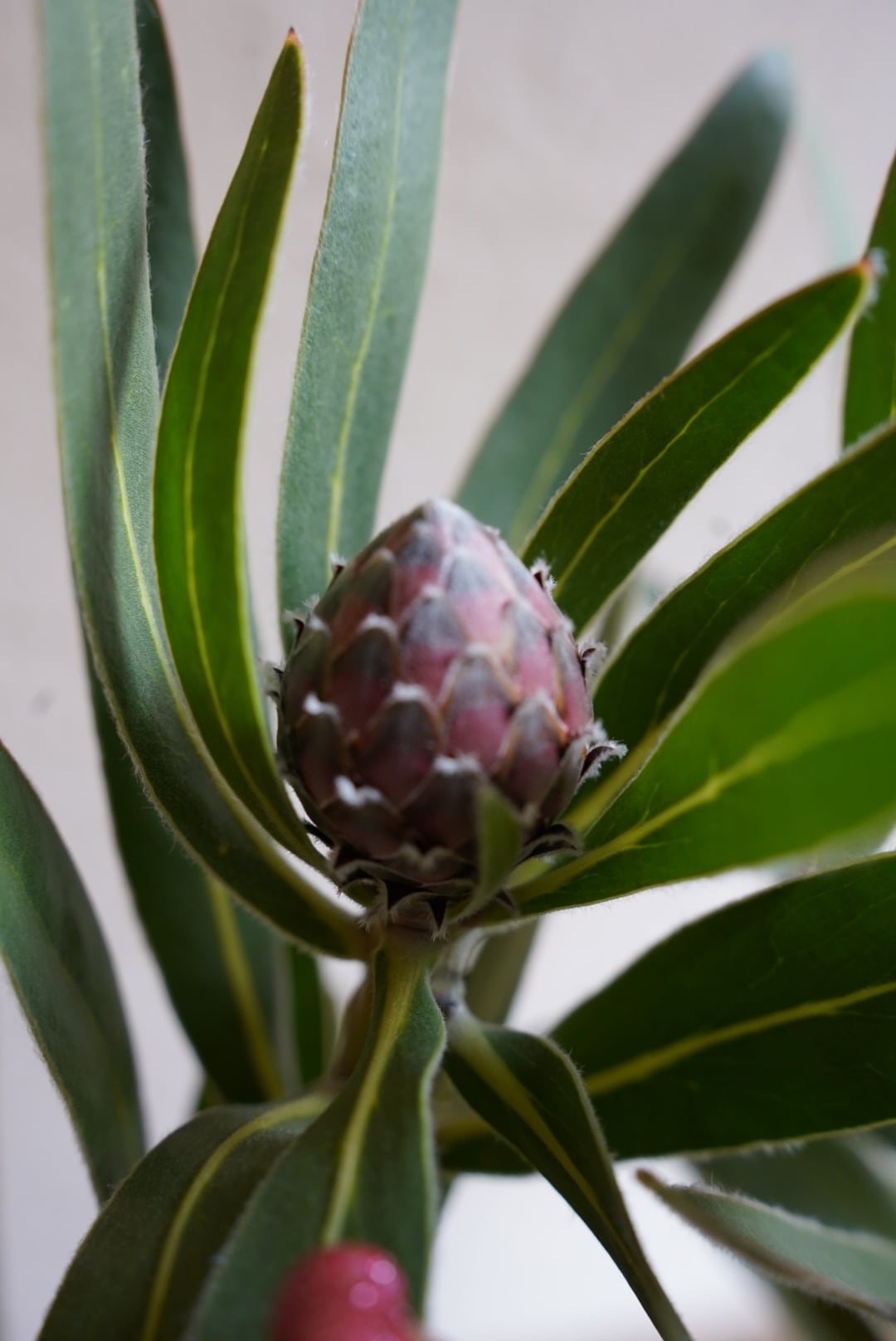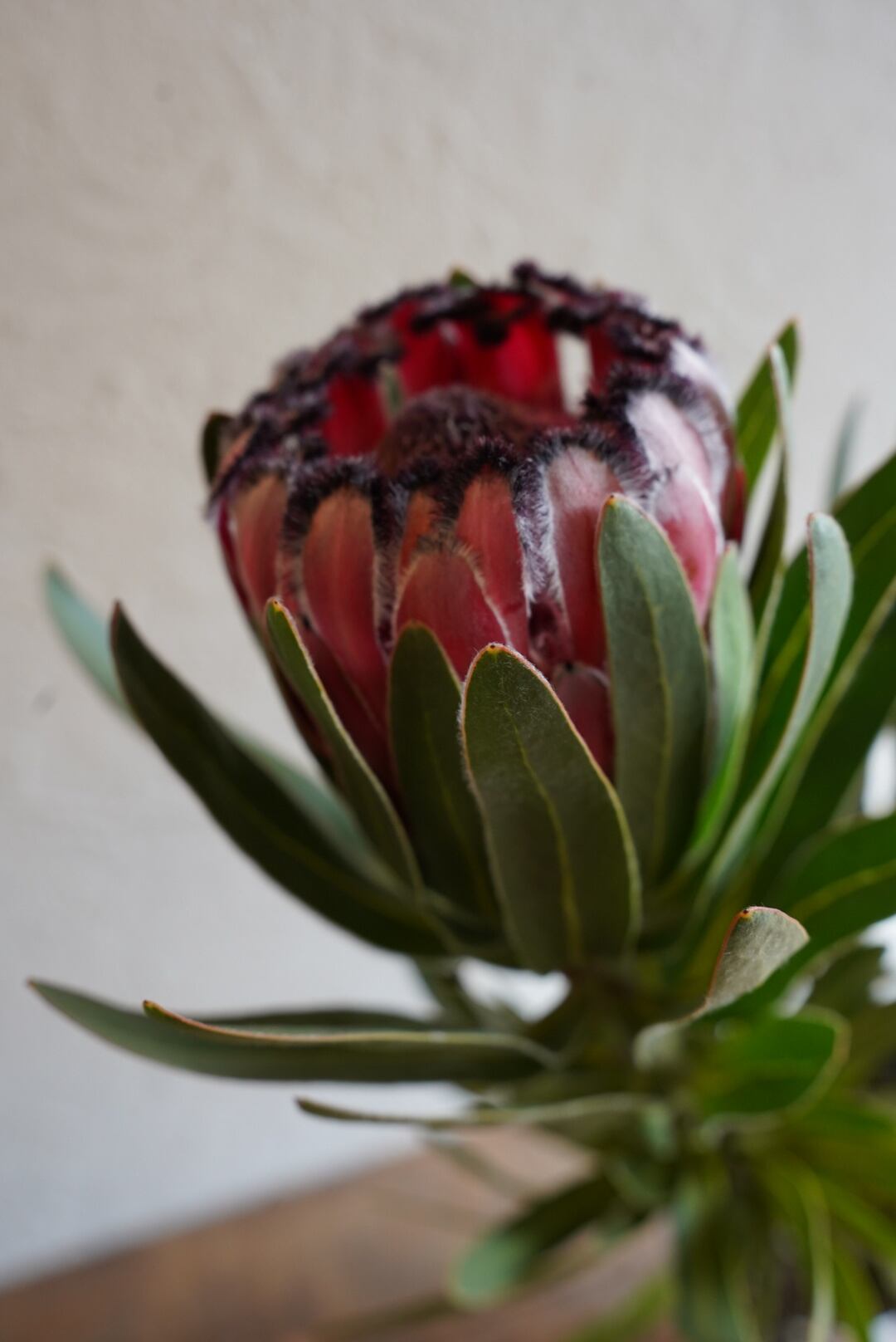 ピンク色のふわふわとした高級感のある花が咲くとても珍しいプロテア。