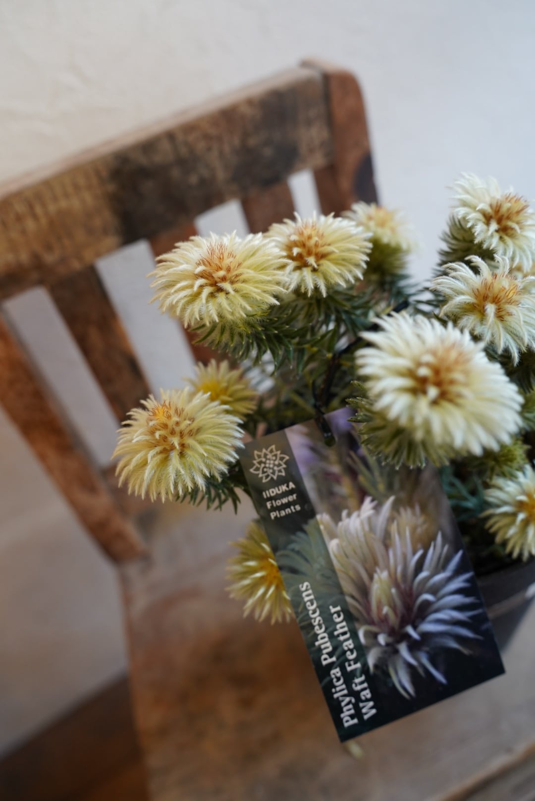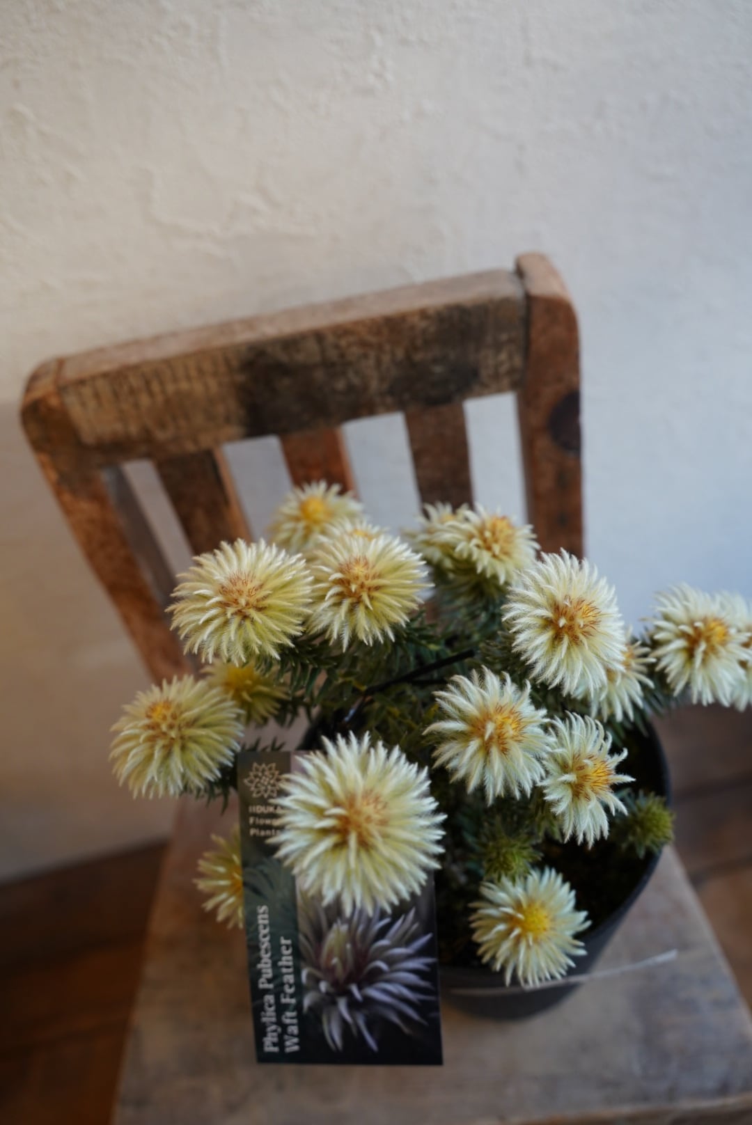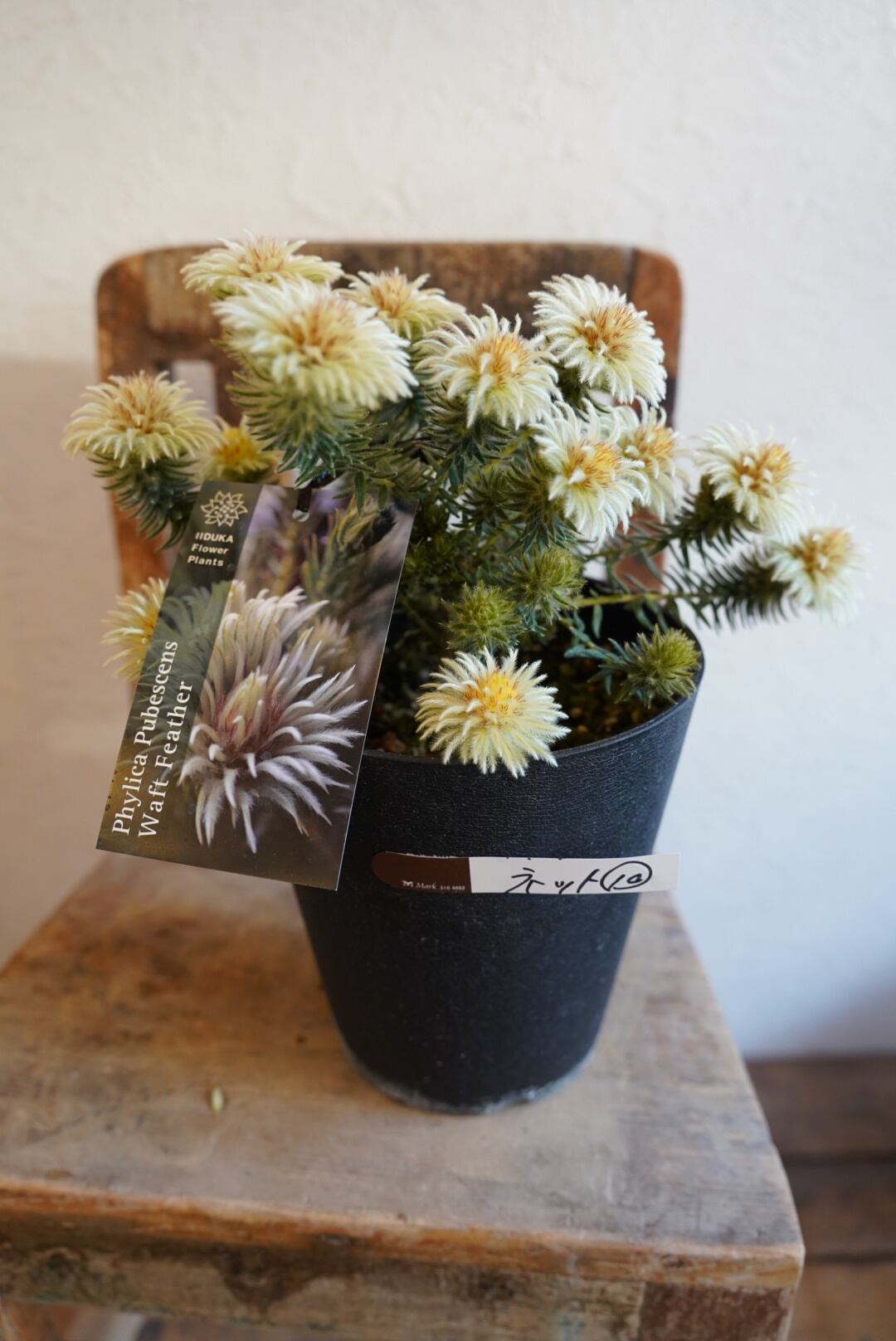 ケモケモした葉っぱが特徴で、枝の先に可愛い白い花が咲く。