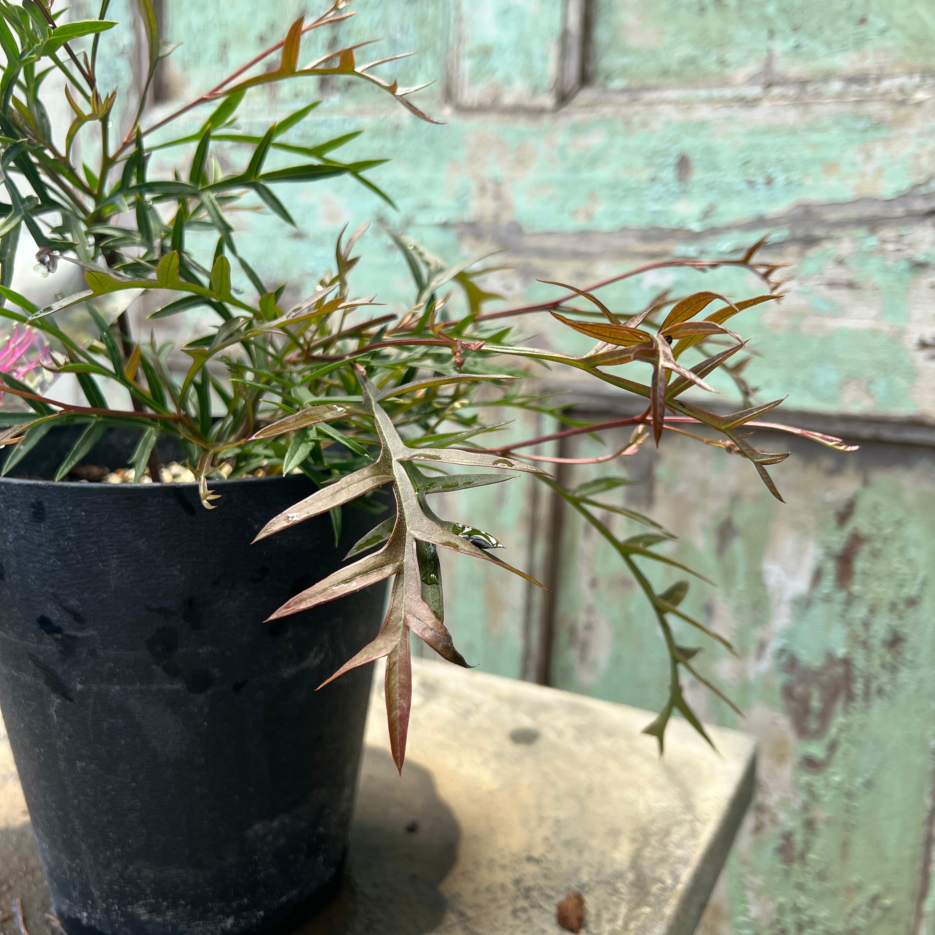 暗めの葉っぱと濃いピンク色の花がかっこいいグレビレア!