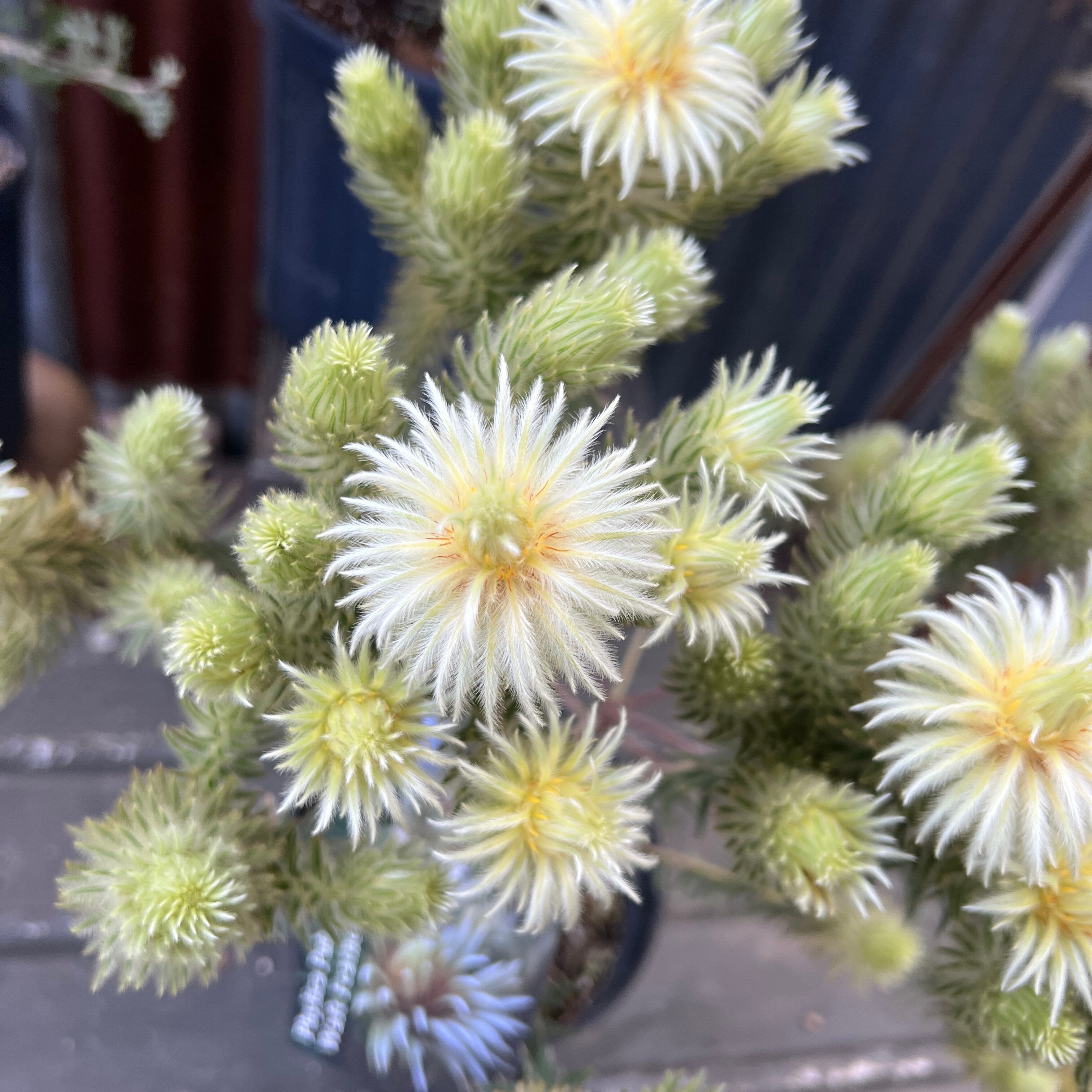 ケモケモした葉っぱが特徴で、枝の先に可愛い白い花が咲く。