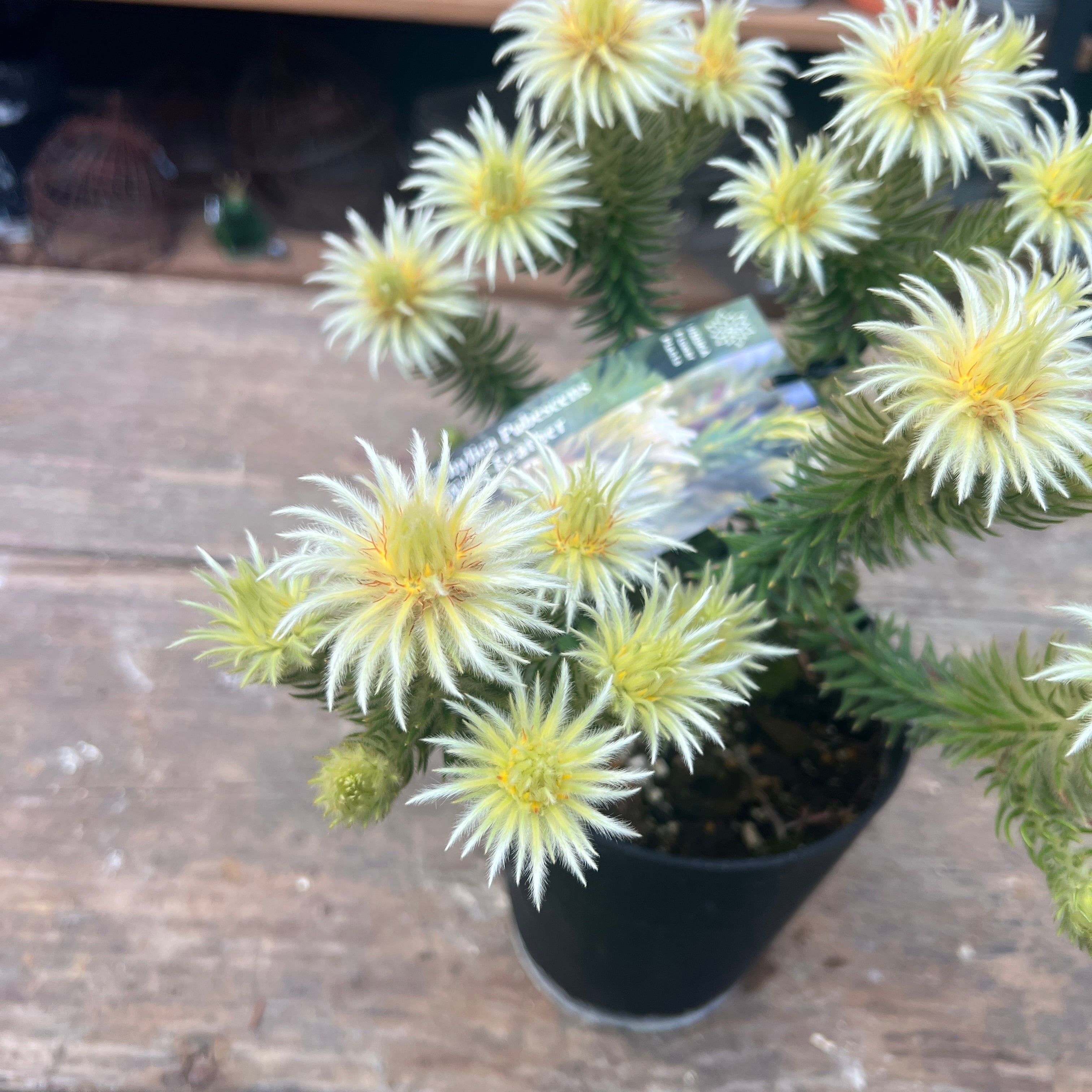 ケモケモした葉っぱが特徴で、枝の先に可愛い白い花が咲く。